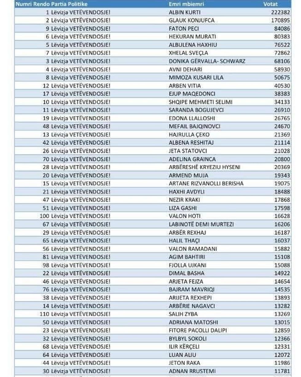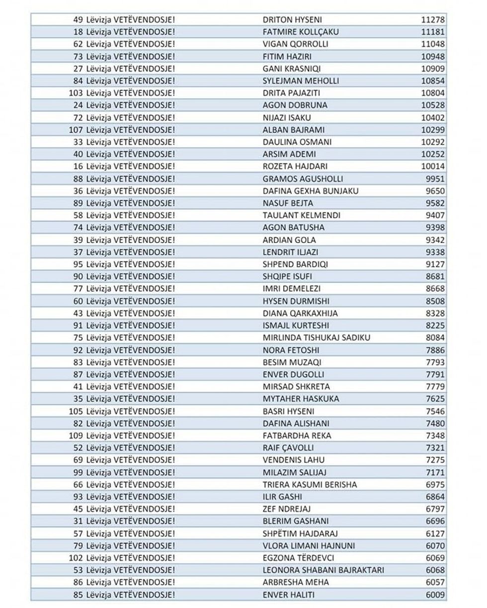 Në këtë listë të Lëvizjes Vetëvendosje i pari prinë lideri Albin Kurti i cili ka marr 222,382 vota, Glauk Konjufca është i dyti me 170,895 vota, pasuar nga Faton Peci me 84,086 vota, Hekuran Murati 80,383 vota, Albulena Haxhiu me 76.522 vota, Xhelal Sveçla me 72,862 vota, Donika Gërvalla Schwaz me 68,106 vota, Avni Dehari me 58,930 vota, Mimoza Kusari Lila me 50,675 vota, Arben Vitia me 40,530 vota.