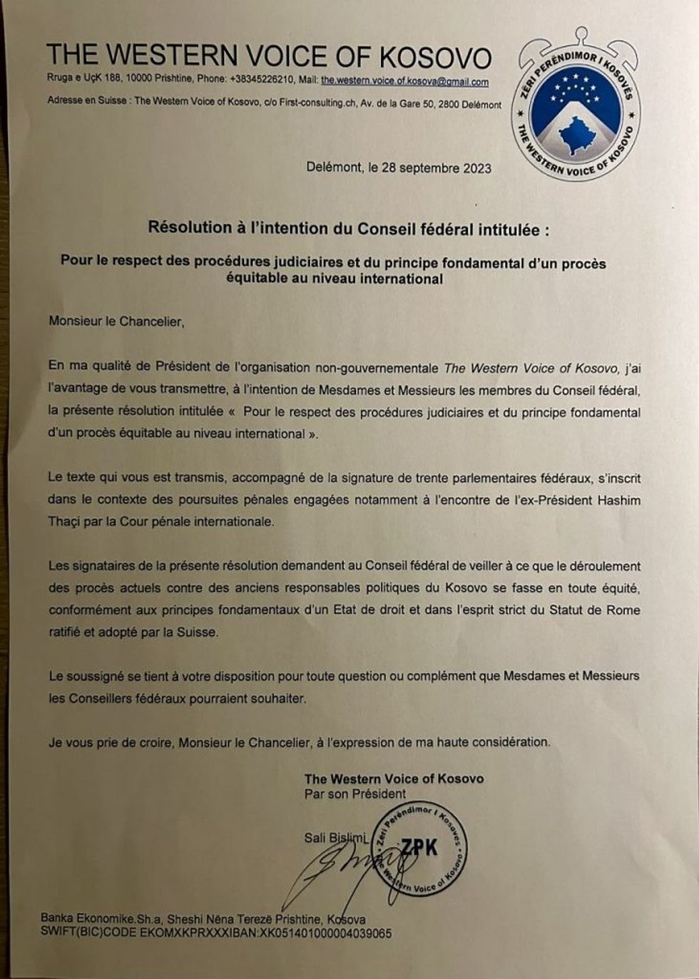 KosovaPress ka siguruar rezolutën e nënshkruar nga 30 deputetë zviceran, të cilët nesër prej orës 11:00 do ta dorëzojë veprimtari Sali Bislimi në Gjykatën Speciale.