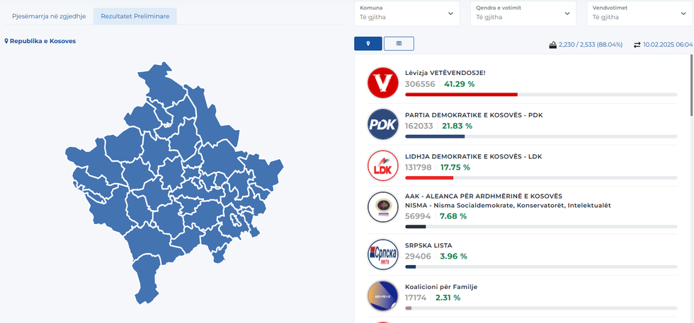 Sipas të dhënave të fundit të publikuara nga KQZ deri më tani janë numëruar 88.04% e votave.