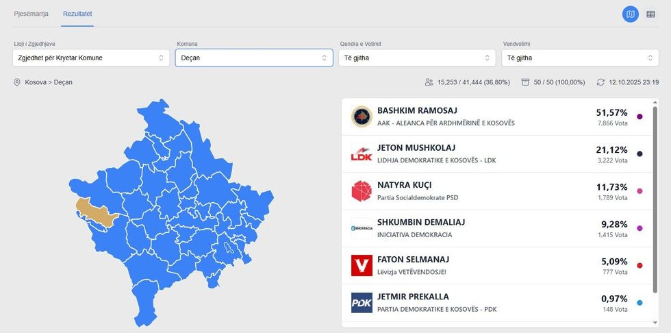 Sipas të dhënave të KQZ-së, në Deçan kanë votuar 15,253 qytetarë nga 41,444 të regjistruar, që përbën 36.80% pjesëmarrje në votime./Telegrafi/