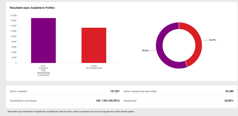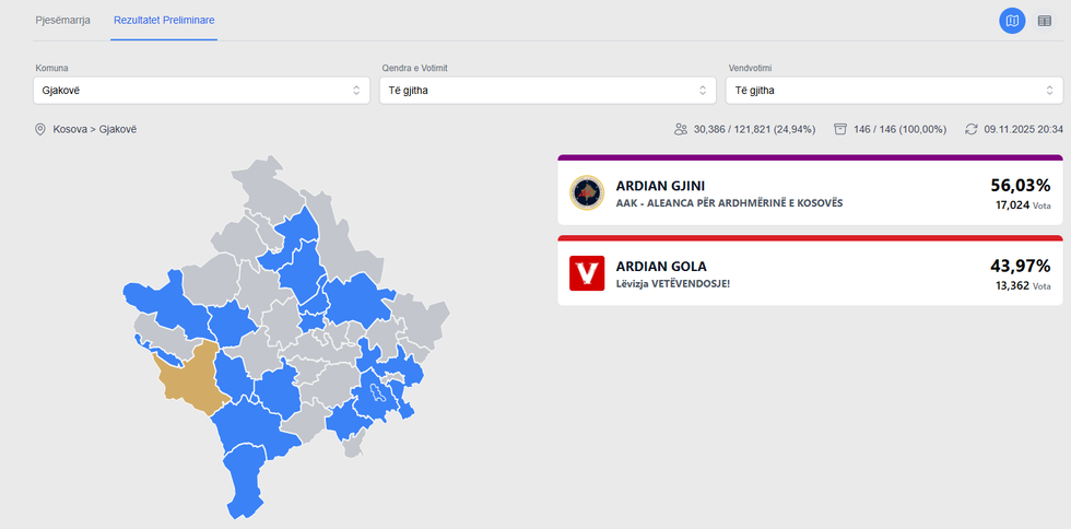 Sipas të dhënave nga 146 vendvotime të përpunuara (100%), kandidati i AAK-së, Ardian Gjini ka marrë 56.03% të votave, që përkthehet në 17,024 vota.