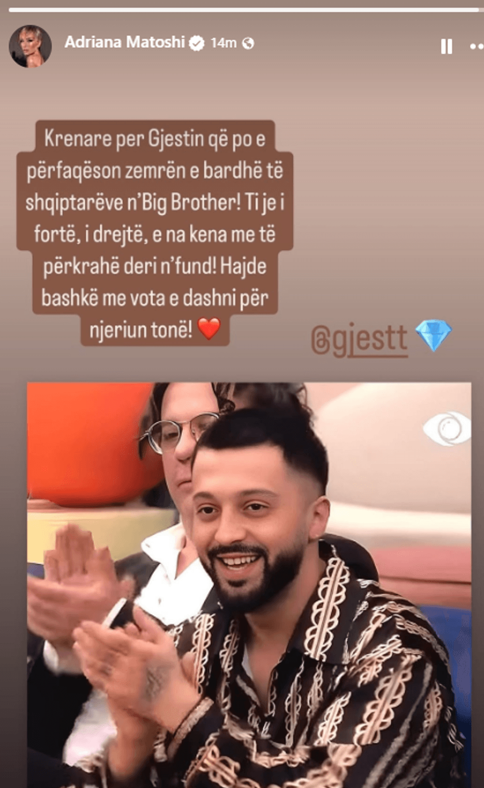 “Krenare për Gjestin që po përfaqëson zemrën e bardhë të shqiptarëve në Big Brother”, tha ajo.