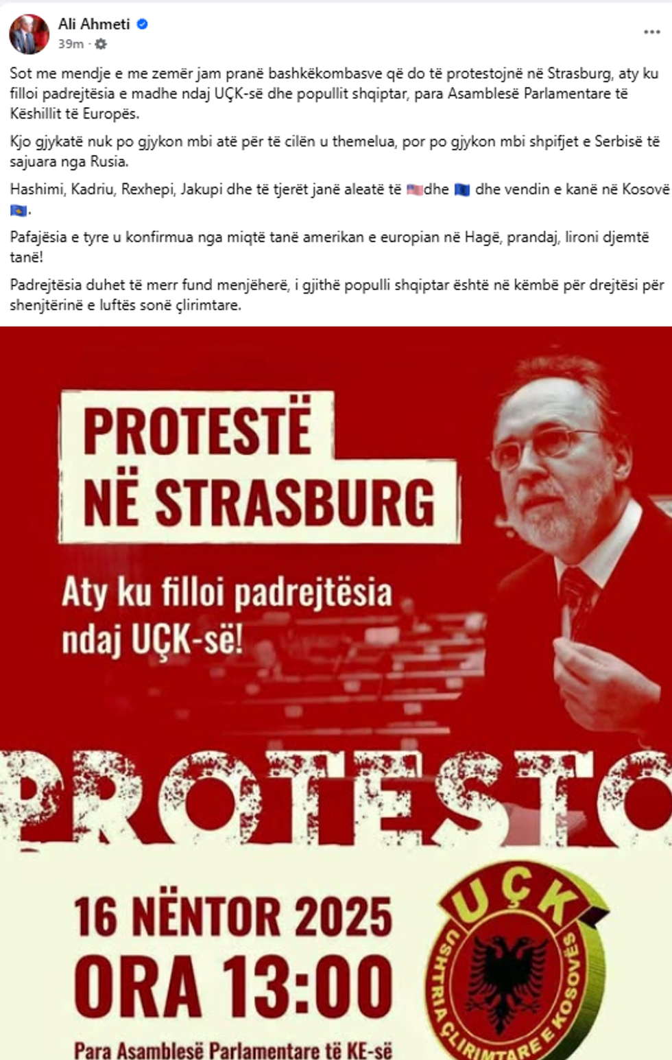 "Sot me mendje e me zemër jam pranë bashkëkombasve që do të protestojnë në Strasburg, aty ku filloi padrejtësia e madhe ndaj UÇK-së dhe popullit shqiptar", ka shkruar ai.