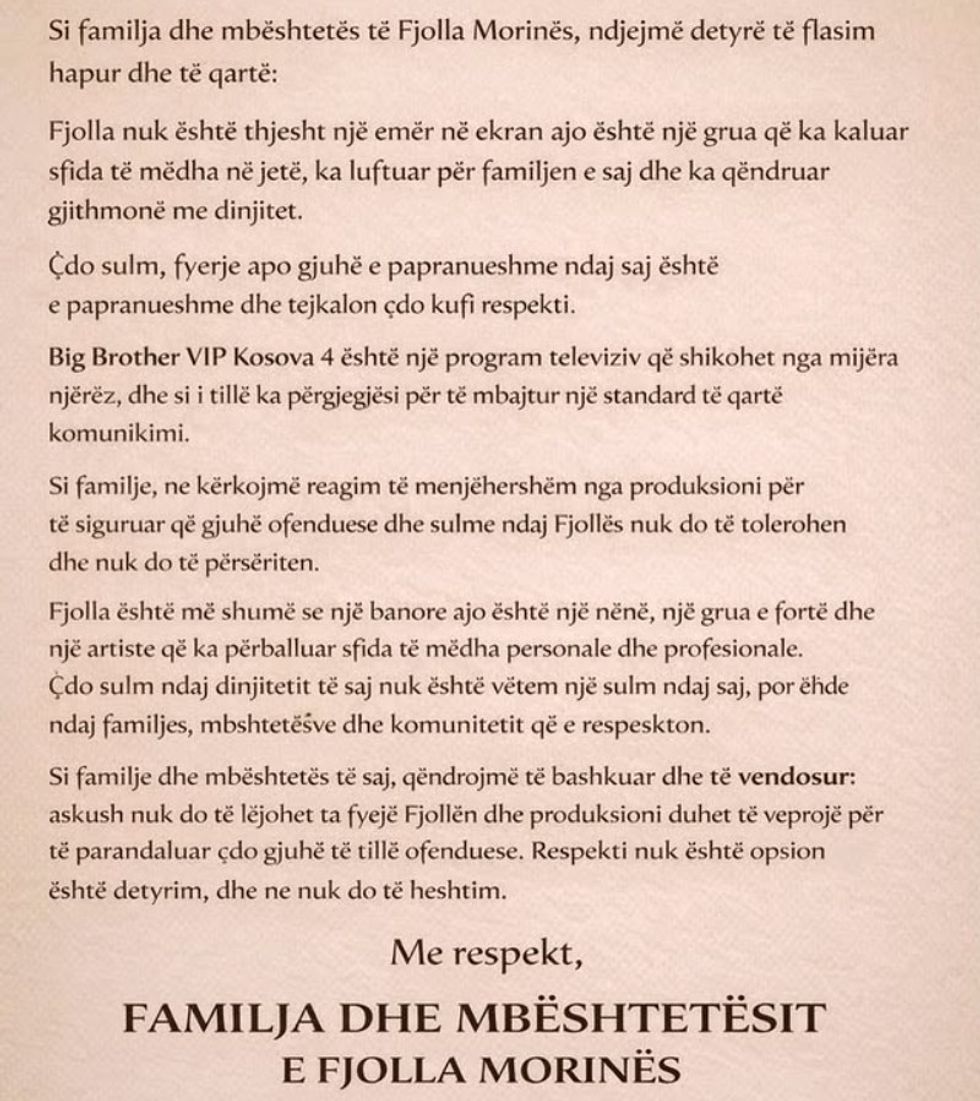 Familja dhe mbështetësit e Fjolla Morinës kanë dalë me një deklaratë publike në rrjetet sociale, duke shprehur indinjatën e tyre për situatat e fundit brenda shtëpisë së Big Brother VIP Kosova.