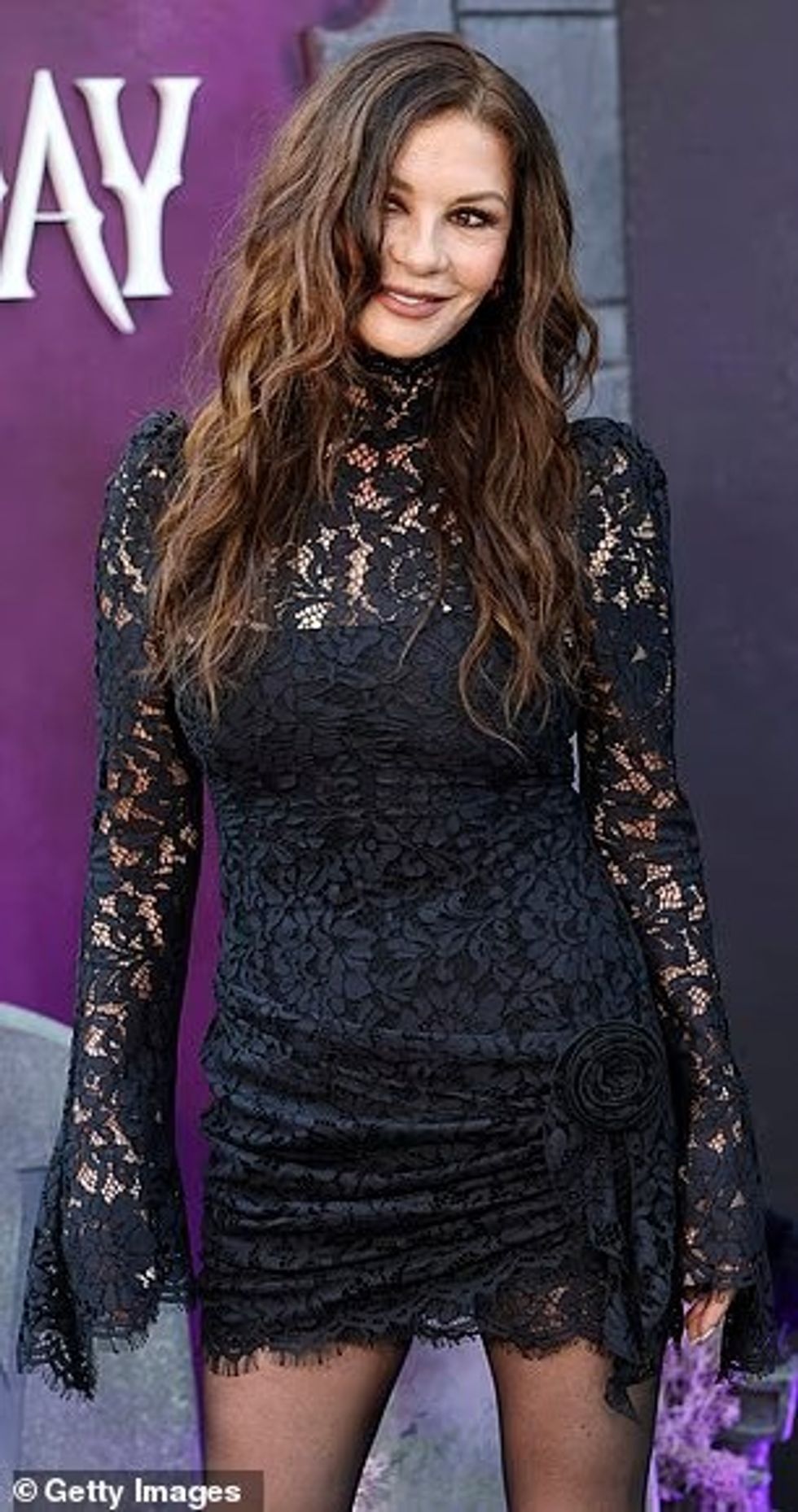 Catherina e cila luan rolin e Morticia Addams në serialin Wednsday të Tim Burton, i kishte lëshuar lirshëm flokët e saj të trashë të errët, duke i ndarë pak anash duke i bërë kaçurrela të buta.