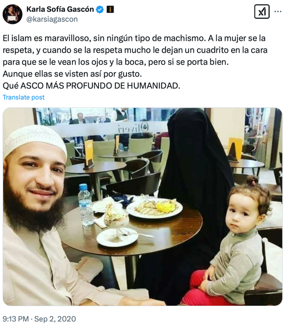 Një tjetër postim i datës 2 shtator 2020, krahas një fotografie të një familjeje myslimane në një restorant ku përfshihet një grua me burka, thotë: "Islami është i bukur, pa asnjë machismo. Gratë respektohen dhe kur respektohen aq shumë, ato kanë mbetur me një vrimë të vogël katrore në ballin e tyre".