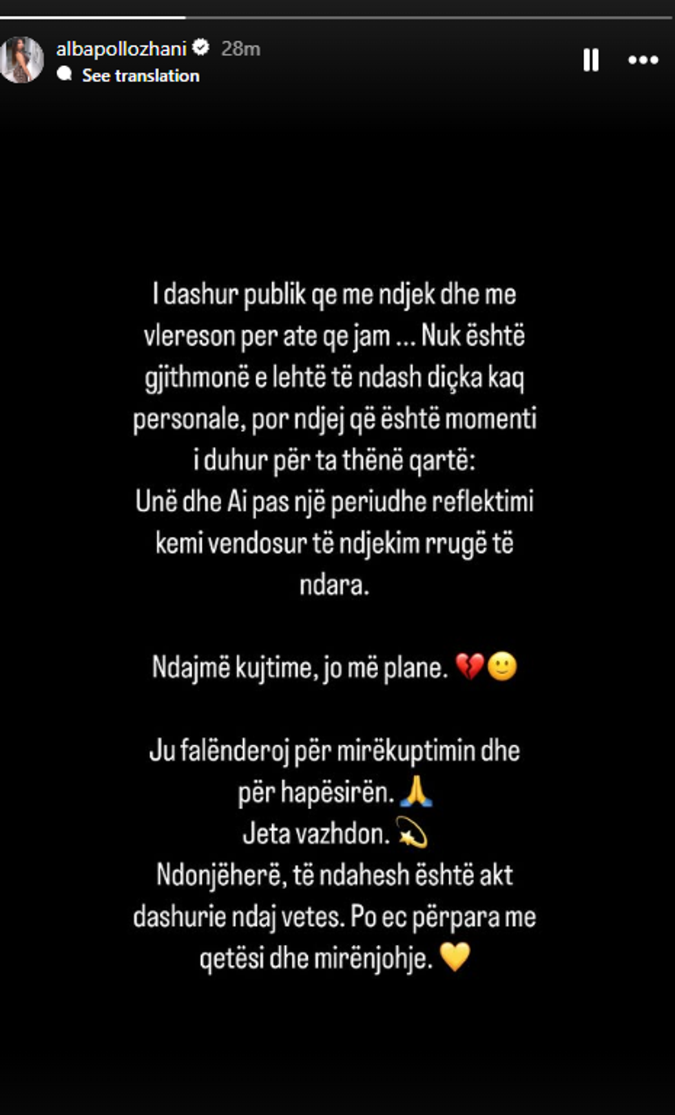 “I dashur publik që me ndjek dhe më vlerëson për atë që jam...Nuk është gjithmonë e lehtë të ndash diçka kaq personale, por ndjej që është momenti i duhur për ta thënë qartë:
