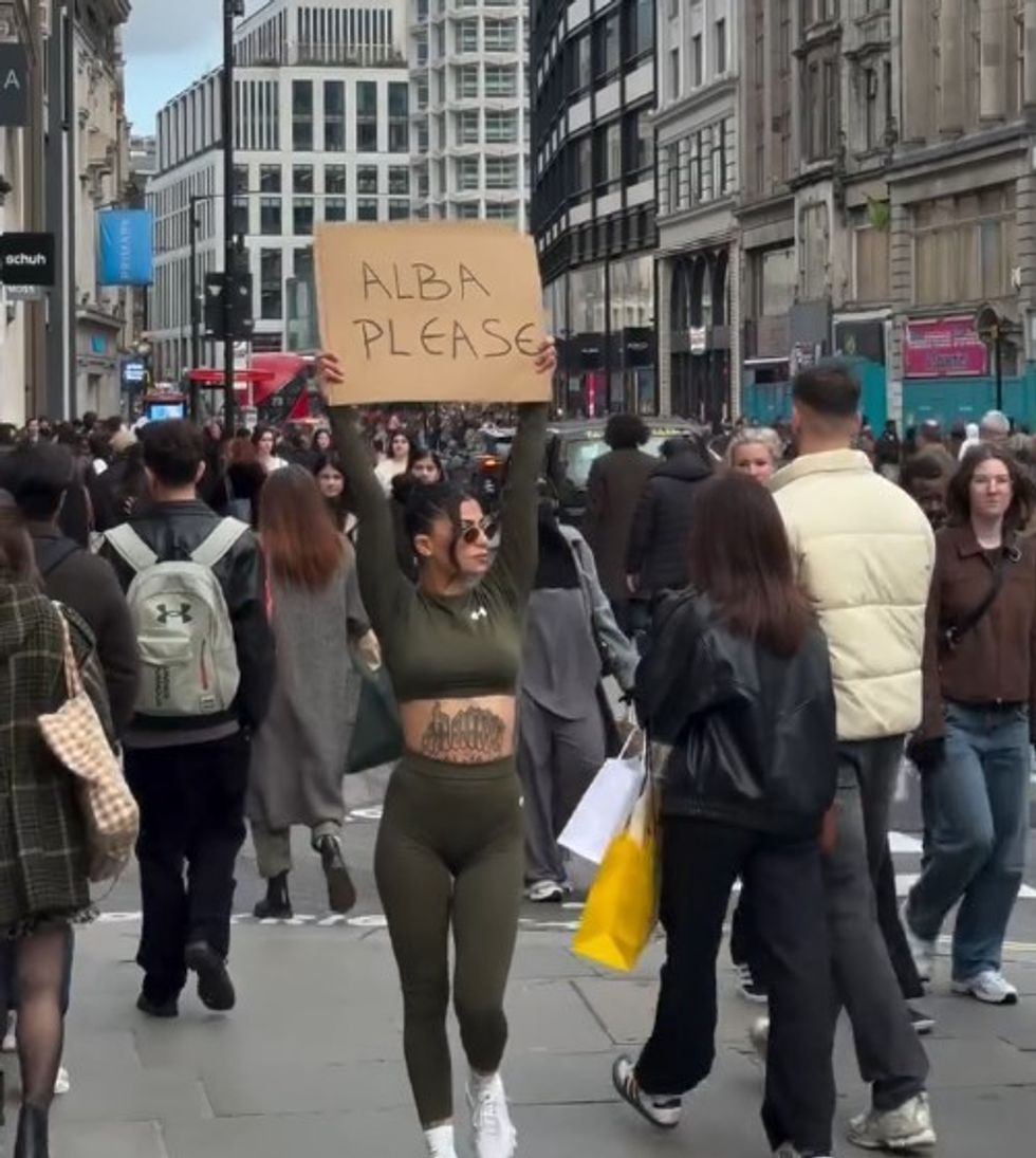 Në pamjet e publikuara, ajo shihet duke mbajtur pankarta në rrugët e njohura të kryeqytetit britanik.