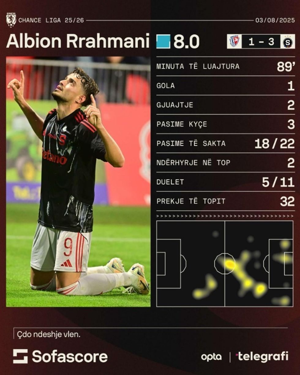 Për golin dhe paraqitjen fantastike që pati në këtë sfidë, Rrahmani u vlerësua me notën 8.0 nga Sofascore.