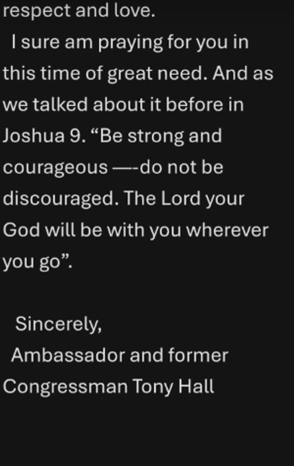 “Ji i fortë dhe trim – mos u dekurajo. Zoti, Perëndia yt, do të jetë me ty kudo që të shkosh”, ka shkruar Hall në mesazhin e tij.