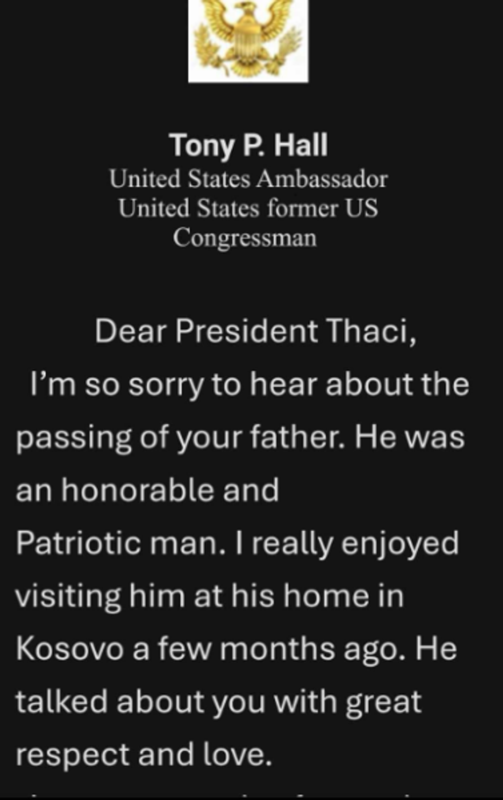 Ambasadori dhe ish-Kongresisti i Shteteve të Bashkuara të Amerikës, Tony P. Hall, i ka shprehur ngushëllimet e tij ish-presidentit të Kosovës, Hashim Thaçi, pas ndarjes nga jeta të babait të tij.