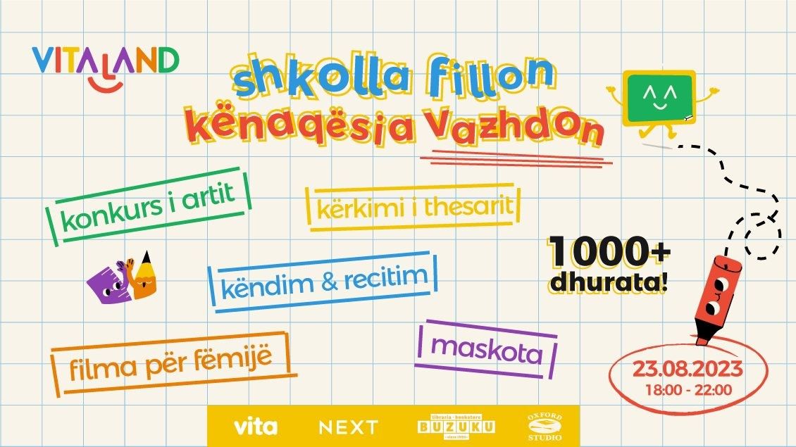 Kthimi në shkollë fillon me festë dhe rreth 1000 dhurata për fëmijët tuaj në VitaLand!Eventi “shkolla fillon kënaqësia vazhdon” që do mbahet sot me fillim nga ora 18:00 në VitaLand, ju fton të përjetoni gëzim, festë dhe kënaqësi të pafundme.Aktivitete të shumta do të ju presin në këtë ditë duke filluar nga konkursi i artit për vizatimin më të mirë, kërkimin e thesarit të fshehur, këndim dhe recitim, maskotat e dashura dhe filmat e preferuar të fëmijëve.Një ditë magjike, për botën magjike të fëmijëve tuaj!Por, ka dhe më shumë VitaLand, Qumështorja Vita, NEXT Kosovo, Libraria Buzuku dhe Oxford Studio ELT do dhurojnë 1000 dhurata për fëmijët që do marrin pjesë në aktivitetin e shumëpritur “shkolla fillon kënaqësia vazhdon”.Prandaj, merrni fëmijët, shokët e familjen dhe përjetoni kënaqësinë e përfundimit të pushimeve verore dhe fillimin e mbarë të vitit shkollor.VitaLand, vendi ku kënaqësia s’ka fund!