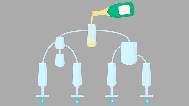 Është një ilustrim me gota dhe shampanjë. Ilustrimi tregon katër gota shampanje që duhet të mbushen duke përdorur tubat që janë të lidhur.