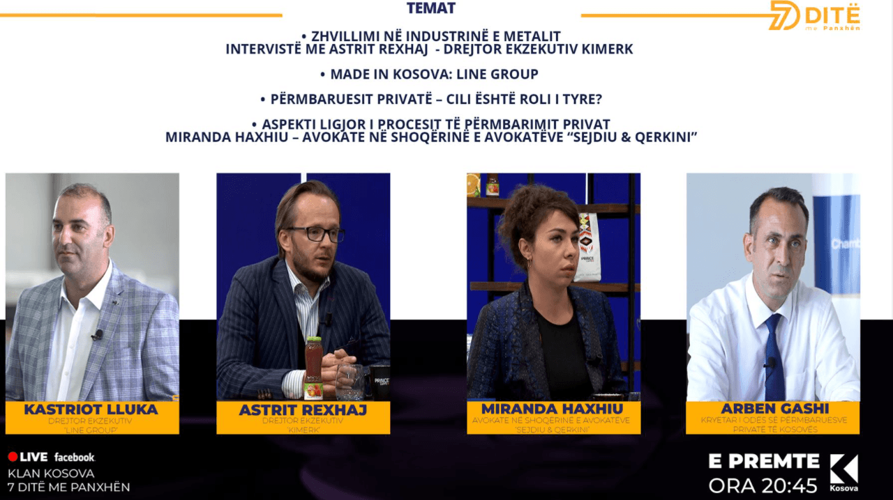 Emisionin e fillojmë me intervistën në studio me Astrit Rexhaj, Drejtor Ekzekutiv KIMERK, me të cilin është bashkëbiseduar për zhvillimin e industrisë së metalit në Kosovë. E me rubrikën Made in Kosova, sjellim storien e suksesit të LINE GROUP, e cila merret prodhimin e dyerve dhe dritareve e fasadave, dhe jo vetëm.