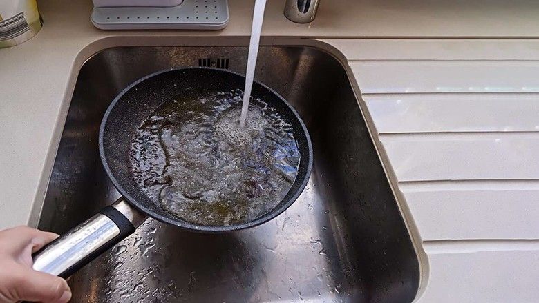 Nuk do të mund të hiqni të gjitha mbetjet e yndyrshme përpara se ta vendosni tiganin nën vrushkull uji. Nëse nuk keni arritur të hiqni mjaftueshëm yndyrën, fillimisht shpëlajeni tiganin me ujë të ftohtë, transmeton Telegrafi.