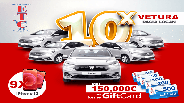 - 10 vetura të reja Dacia Logan- 9 telefona të mençur iPhone 12- Mbi 150,000 euro Gift Card me vlera prej 500, 200, 100, 50 dhe 20 eurove