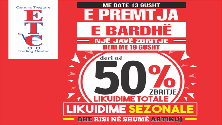 E PREMTJA E BARDHË Super aktivteti nga ETC në kohën e ndrrimit të sezonave me ZBRITJE DERI 50 % dhe LIKUIDIME TOTALE SEZONALE në shumë artikuj.
