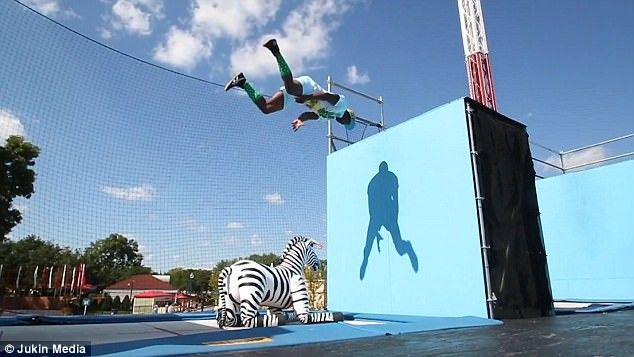 Elijah Noel Hol që është pjesëtar i Cirque Du Soleil, ka shfaqur aftësitë e mahnitshme në trampolinë, teksa kalëron një zebër gome.