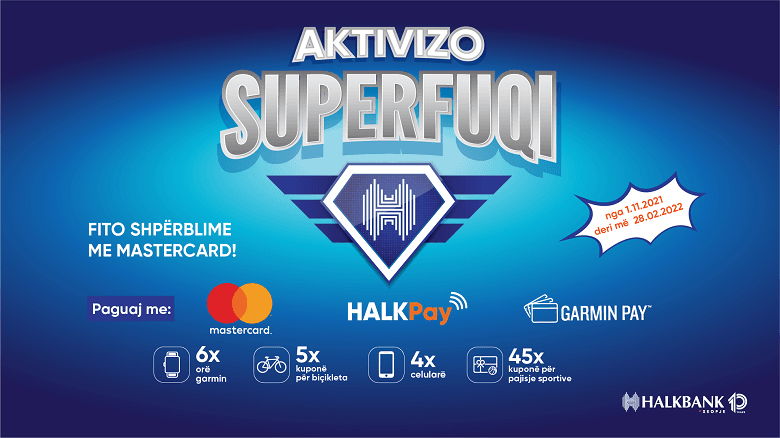 Lajm i mirë për përdoruesit aktual dhe të ardhshëm të shërbimeve të Halkbank: ka ardhur koha për super shpërblime! Në bashkëpunim me Mastercard, loja e re e madhe shpërblyese nën sloganin argëtues "Aktivizo superfuqi" nga sot po merr vrull në të gjithë vendin, në tre mënyra të ndryshme: me transaksionet e kryera me kartat e kreditit Mastercard, si dhe me transaksionet e kryera përmes shërbimeve inovative të Bankës, HalkPay dhe GarminPay. Loja shpërblyese zgjat 4 muaj, deri në fund të muajit shkurt 2022.