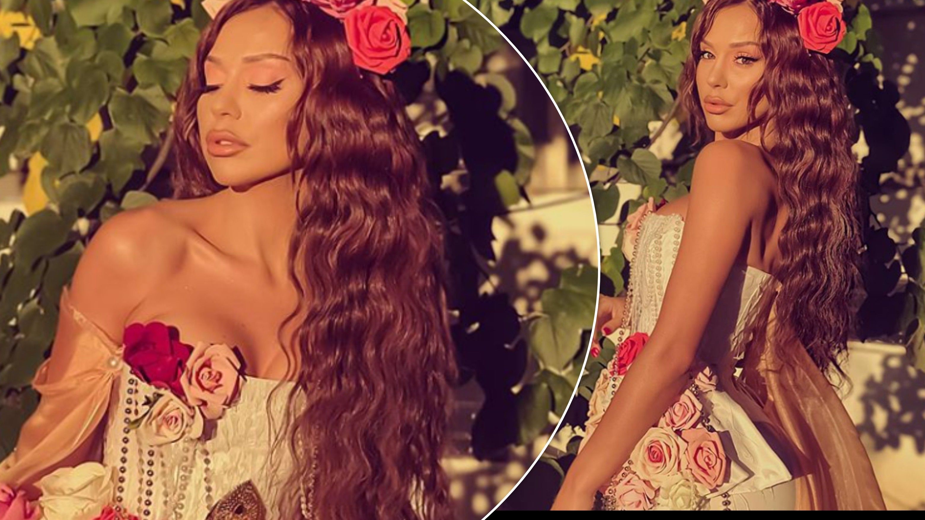 Ajo vjen e veshur me një kostum të mahnitshëm të dekoruar me lule, teksa shfaqet me stil të veçantë flokësh.