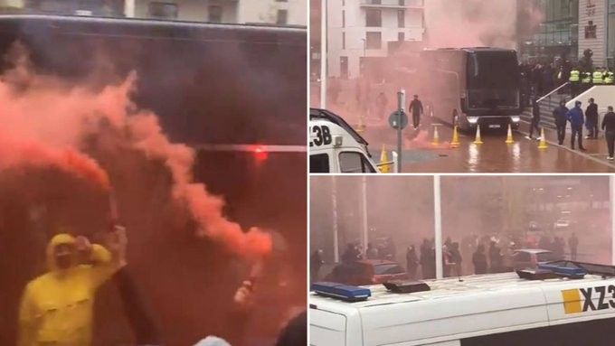 Ndeshja e së dielës u hodh në dyshime herët pasdite, kur përkrahësit e Djajve të Kuq filluan të protestonin jashtë hotelit Lowry në qendër të qytetit të Mançesterit, ku lojtarët qëndronin përpara ndeshjeve.