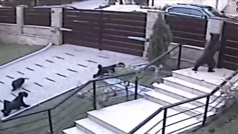 Gjithçka dukej e qetë në oborrin e një gruaje në Rumani, teksa qentë e saj luanin aty.