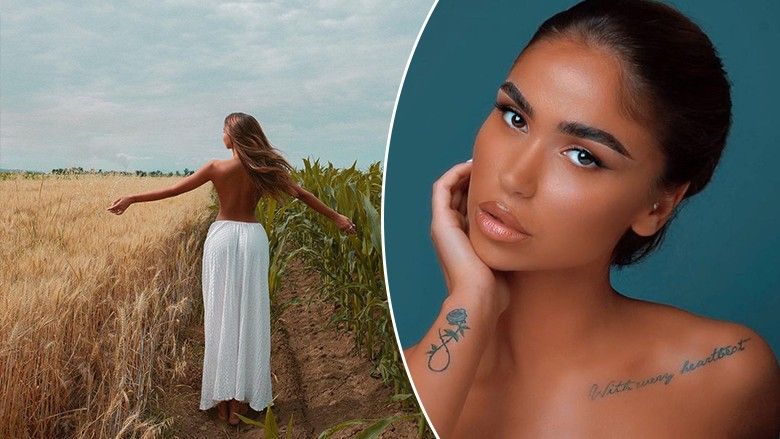 Arta Nitaj pozon e zhveshur në pjesën e sipërme në tokat bujqësore