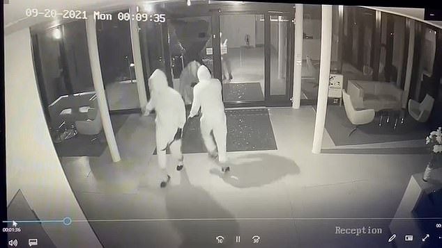 Pamjet e kamerave tregojnë tre nga burrat, të armatosur, që thyejnë “dy dyer xhami” që çojnë në hollin e 1 Meadlake Place.