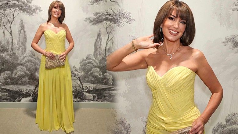 Fustani me prerje të hapur dhe rrudha të lehta theksonte në mënyrë të hijshme siluetën e saj, ndërsa ngjyra e verdhë i jepte pamjes një ndjesi pozitive dhe rrezatuese.