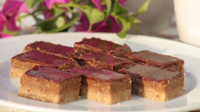 2. Çokollata shkrihet me pak gjalpë dhe me 2 lugë ujë. Kjo shkrirje derdhet përmbi ëmbëlsirë dhe lihet në frigorifer për t'u shtrënguar. Ëmbëlsira e ftohur mirë pritet në katrorë.