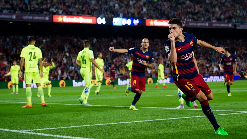 256:"BARCELONA, SPAIN - SEPTEMBER 20: Marc Bartra of FC Barcelona celebrates after scoring the opening goal during the La Liga match between FC Barcelona and Levante UD at Camp Nou on September 20, 2015 in Barcelona, Spain. (Photo by Alex Caparros/Getty Images)