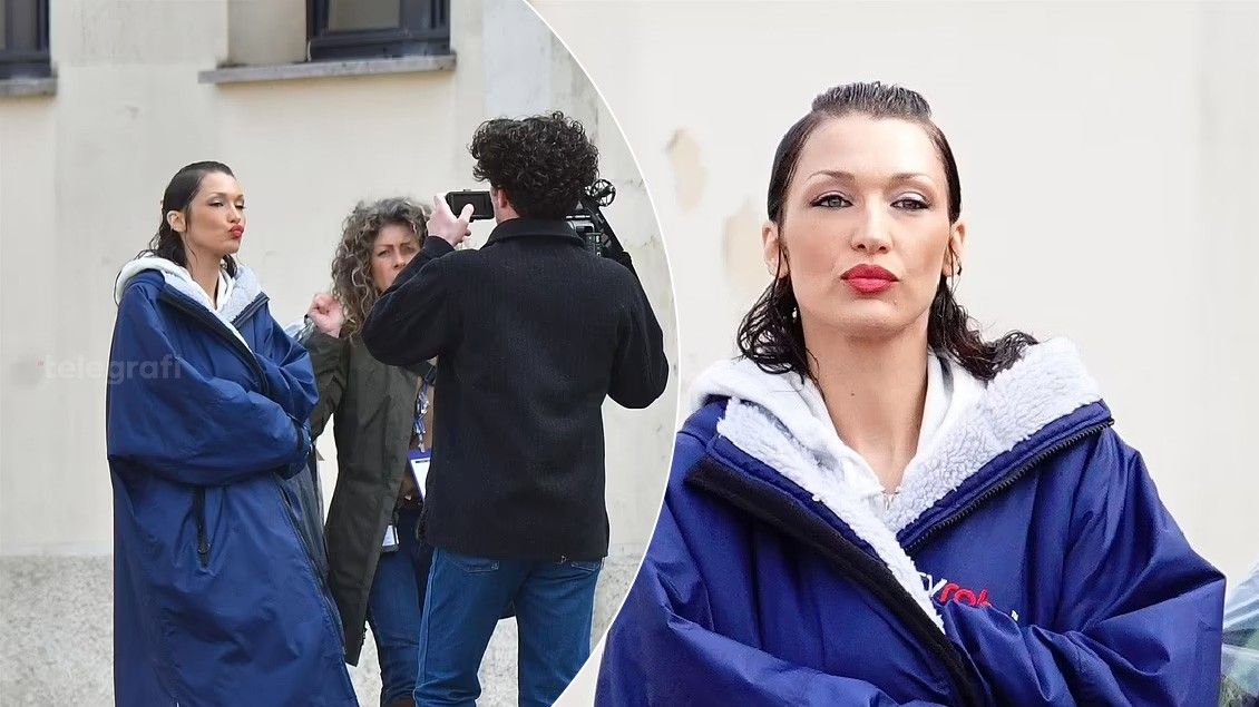 Gjatë xhirimeve në temperaturat e ftohta, Bella u mbështoll me një pallto të madhe Dry Robe me kapuç blu dhe lesh të bardhë, mbi një bluzë të bardhë dhe pantallona sportive gri, shkruan DailyMail.