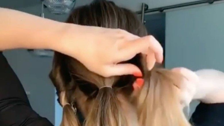 Lidhni flokët në tre bishta në majë të kokës, më pas kaloni secilën përmes një brez llastiku.