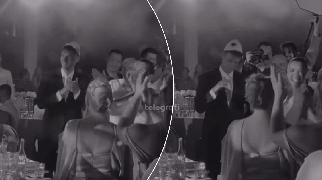 Në një nga momentet më të përfolura të mbrëmjes, Pavard shihet duke kërcyer i buzëqeshur me muzikë shqiptare, teksa mban mbi kokë një plis të bardhë.