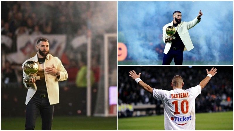 Me xhinse dhe një xhaketë të bardhë, i shoqëruar nga gjashtë nga ish-edukatorët e tij në Lyonnais (Cyrille Dolce, Robert Valette, Guy Genet, Robert Duverne, Gérard Bonneau, Armand Garrido dhe Bernard Lacombe), ylli i futbollit francez, Benzema, morit topin e tij të artë dhe e ngriti në qiell.