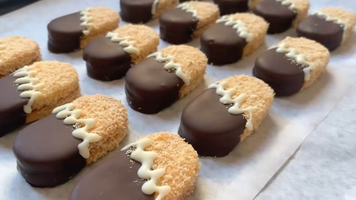 Gjysmën e biskotave lyeni me çokollatë, gjysmën tjetër me reçel dhe spërkatini me kokos.