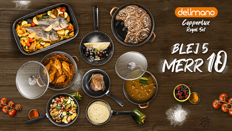 Delimano ofron setin më të ri të enëve Royal nga linja e fundit e gjeneratës së enëve Stone Legend Copperlux, me ofertën ekskluzive BLEJ 5, MERR 10. Telefononi falas në numrin pa pagesë 0800 100 90 ose klikoni KËTU për porosi online!