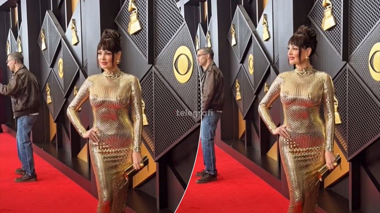 Bleona tërheq vëmendjen në tapetin e kuq të Grammy Awards me një fustan ari