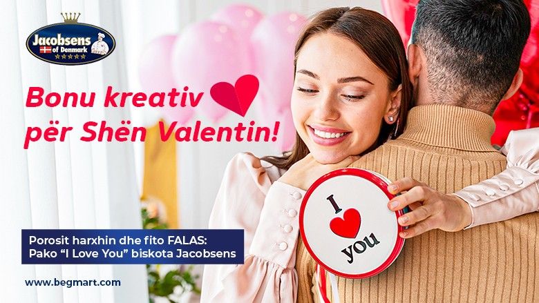 Në ÇDO POROSI që ju bëni në Begmart.com, do të merrni FALAS një kuti të veçantë “I Love YOU” me biskota daneze Jacobsens, e cila pa dyshim se do të befasojë më të dashurën apo më të dashurin tuaj.