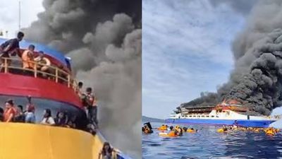 Britma dhe thirrje për ndihmë, pasagjerët hidhen në ujë për të shpëtuar - ndërsa trageti përfshihet nga flakët në brigjet e Indonezisë