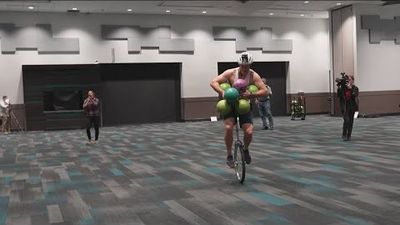 Burri nget biçikletën më një rrotë, duke mbajtur në duar shtatë topa boulingu për të thyer rekordin botëror