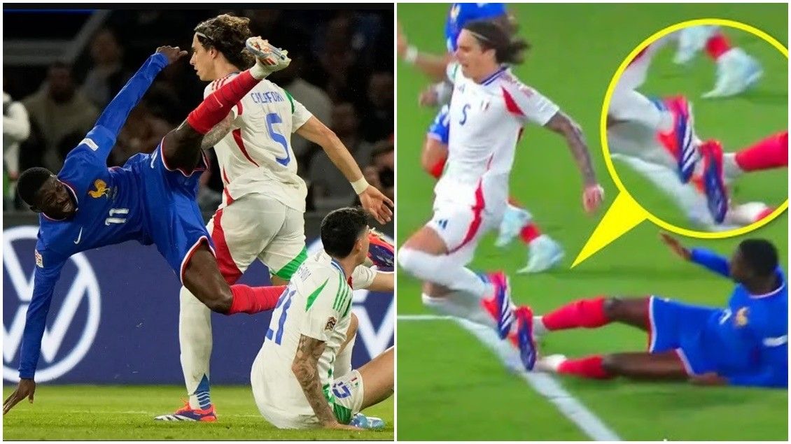 Alessandro Bastoni hyri në duel me Dembele pasi francezi kishte kaluar tashmë disa lojtarë të Italisë, duke e ‘detyruar’ sulmuesin të fluturonte në ajër pa kontroll mbi uljen e tij.