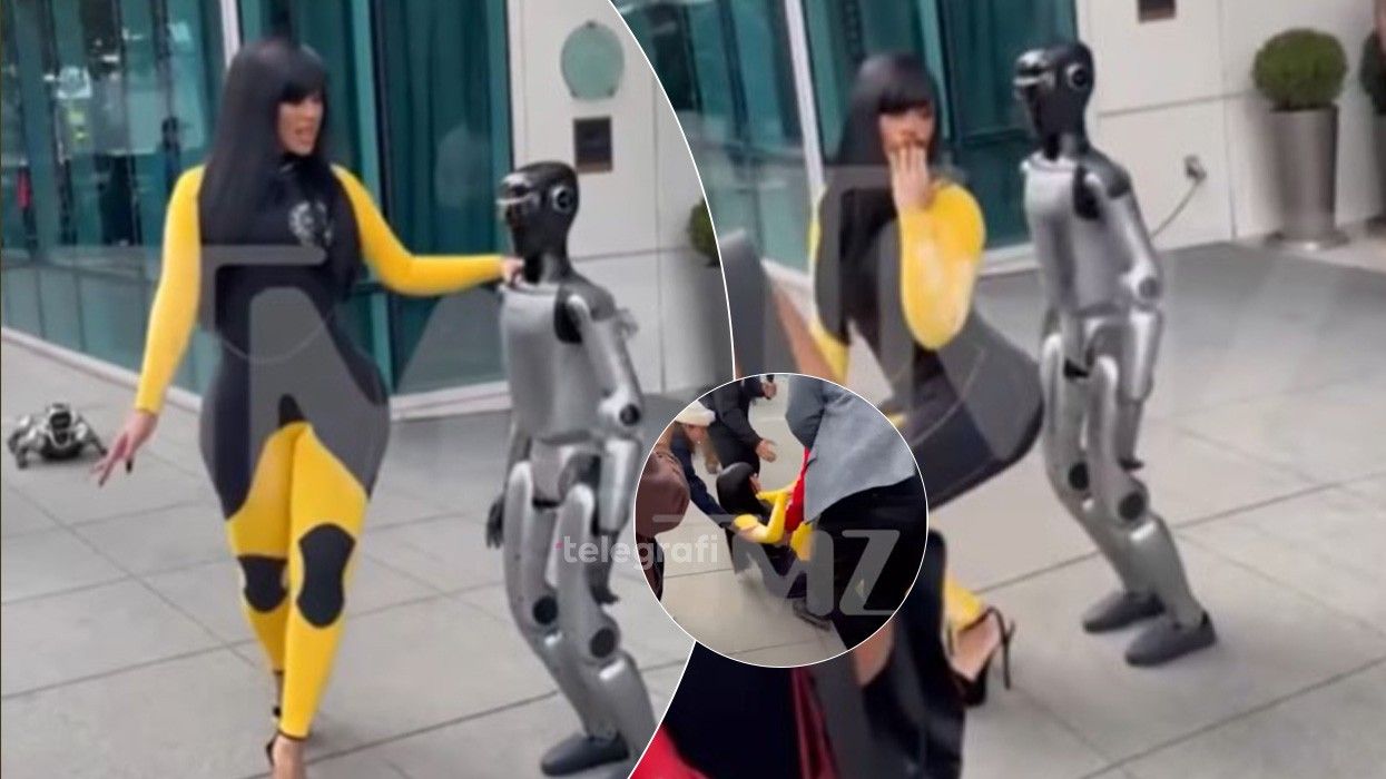 E veshur me një kostum të zi dhe të verdhë dhe këpucë me taka, ajo filloi të bënte shaka me robotin, duke thënë: “Largohu nga burri im” dhe duke i bërë një vallëzim në prehër.