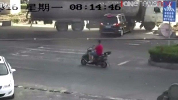 Një çift kinez kanë pasur një shpëtim për “një fije floku” nga vdekja, pasi autobusi u rrafshua për tokë nga një kamion i madh.