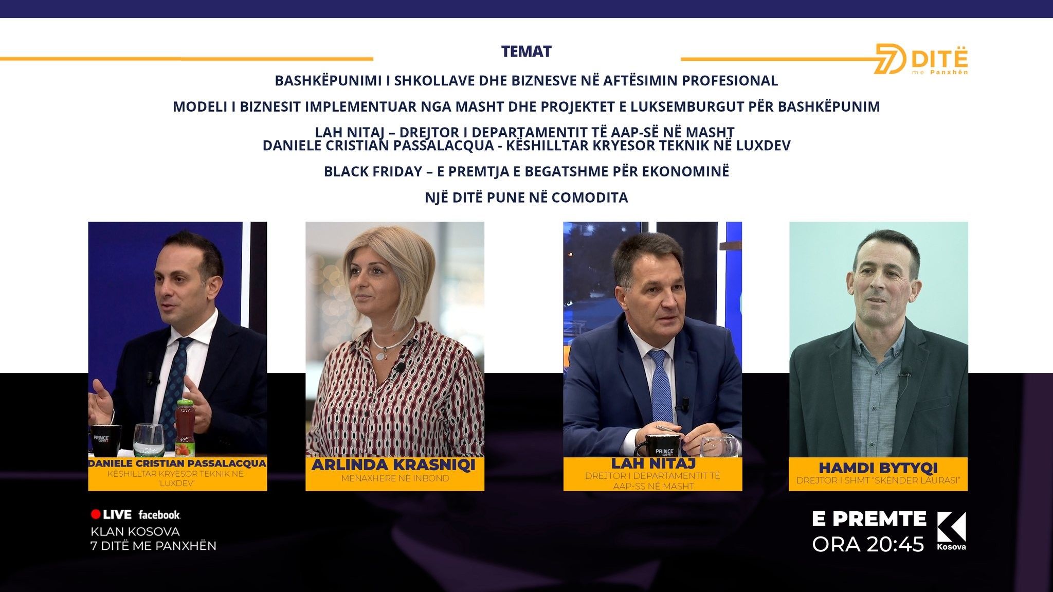 E, për një shtjellim më të zgjeruar rreth Modeli i biznesit implementuar nga MASHT dhe projektet e Luksemburgut për bashkëpunim, në studio është bashkëbiseduar me Lah Nitaj – drejtor i Departamentit të AAP-së në MAShT dhe Daniele Cristian Passalacqua - Këshilltar kryesor teknik në LuxDev.
