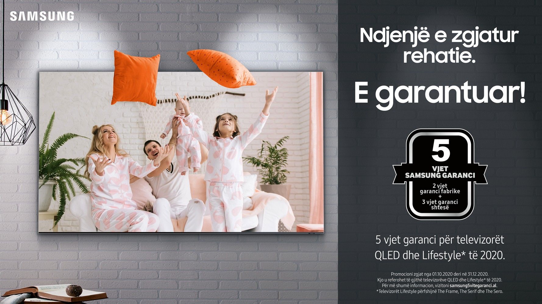 Shfrytëzoni promocionin fantastik të Samsung ng 01.10.2020 deri në 31.12.2020 dhe përfitoni 5 vjet garanci për televizorin e blerë, i cili është i vlefshëm për seritë QLED dhe Lifestyle të 2020. Listën e plotë të produkteve në promocion mund ta gjeni në faqen e internetit samsung5vitegaranci.al. Për t'u kualifikuar për garancinë 5 vjeçare, duhet të regjistroni pajisjen tuaj në faqen e internetit samsung5vitegaranci.al jo më vonë se 15 ditë nga data e blerjes.