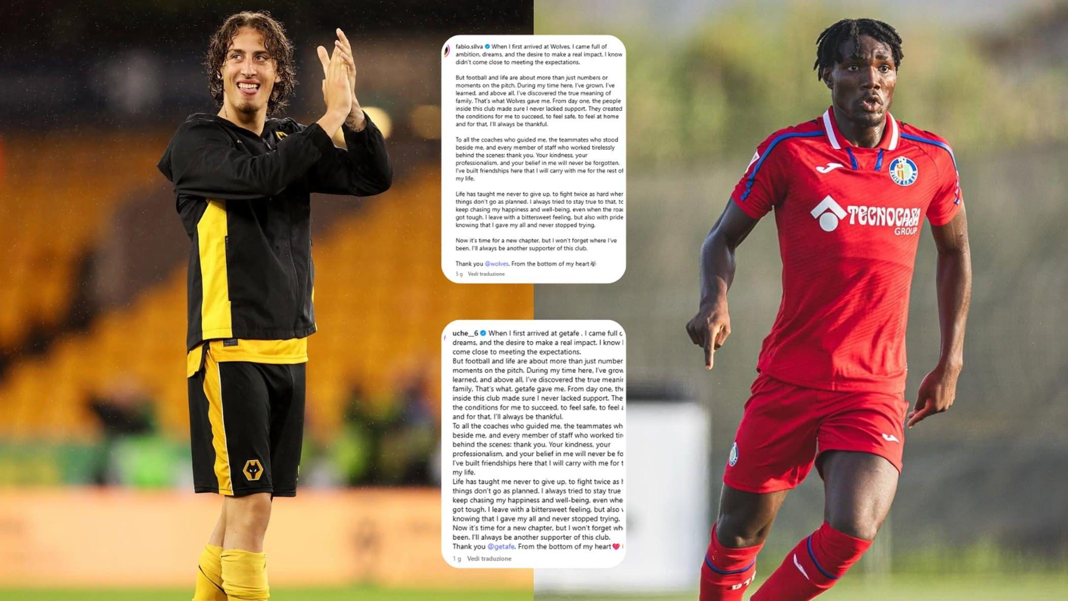 “Kur mbërrita për herë të parë te Wolves, isha plot ambicie, ëndrra dhe dëshirë për të pasur një ndikim të vërtetë. E di që nuk ia dola dot mbanë për të përmbushur pritjet”, shkruante në fillimin e tekstit të Silvas, teksa te Uche në vend të Wolves shkruante Getafe.