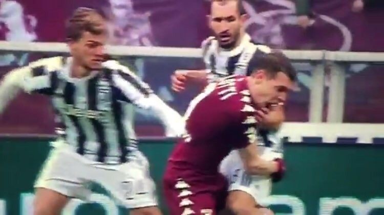 Mbrojtësi i Juventusit, Giorgio Chiellini, rrezikon pezullimit pasi kamerat kanë kapur goditjen e tij ndaj Andrea Belottit.