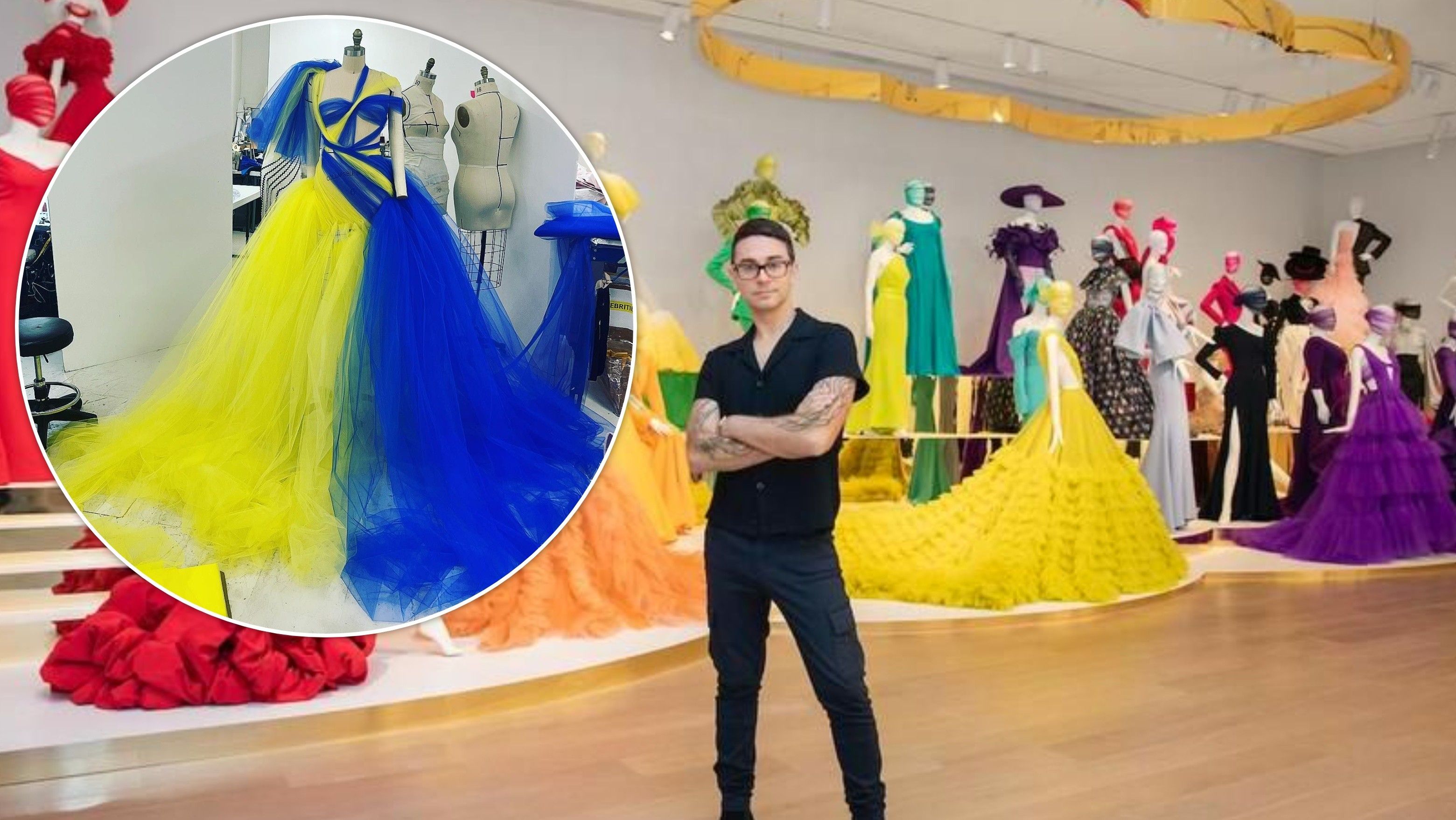 "Si stilist zëri ynë janë rrobat tona!", tha studenti i "Project Runway", duke ndarë një foto të një krijimtarie të ndezur prej tyli në ngjyrat e flamurit ukrainas që do të dalë në ankand për të përfituar bamirësi.