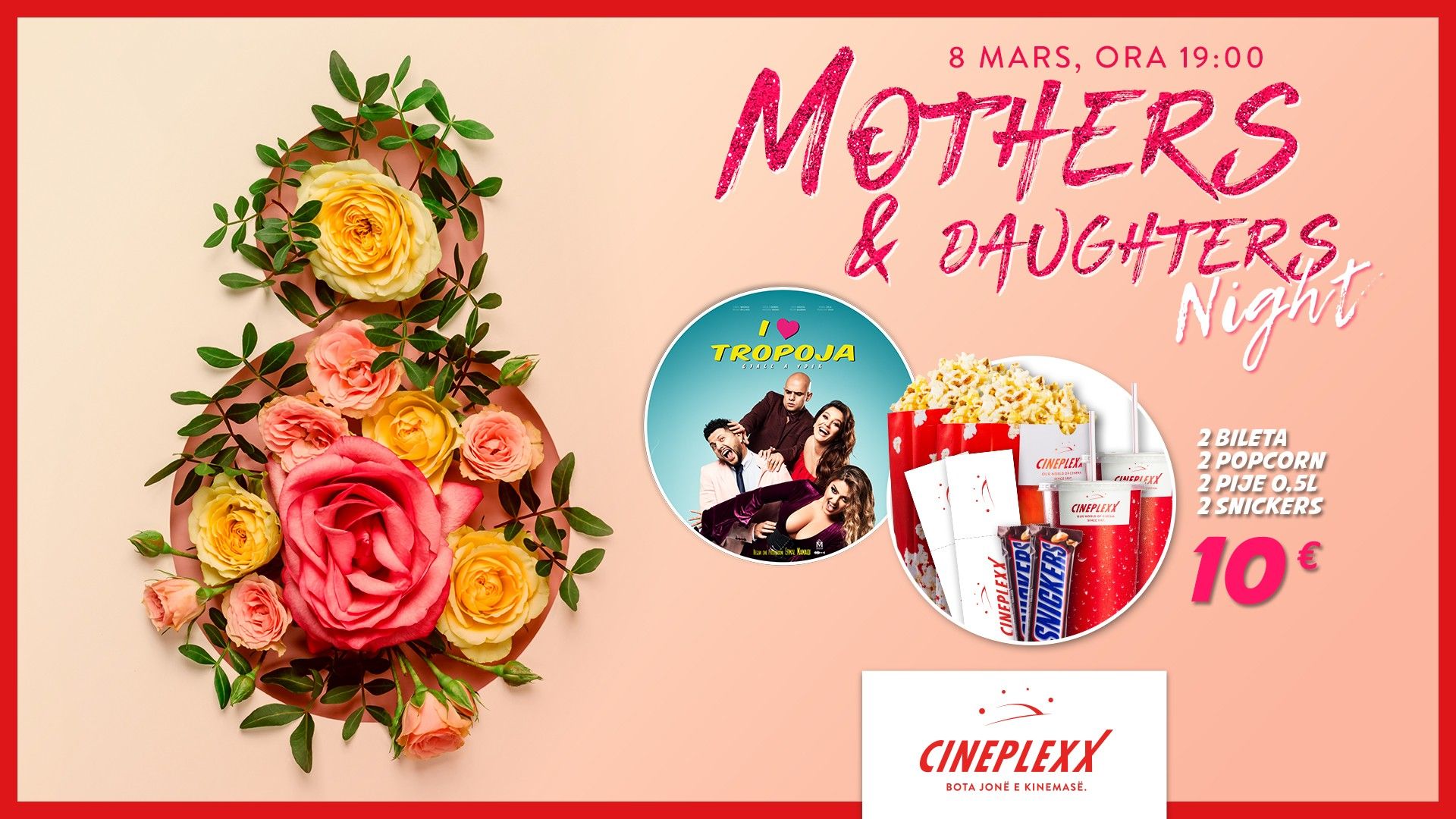 Ditën Ndërkombëtare të Gruas mund ta kaloni duke e shikuar një nga filmat më me zë vendor të momentit. Cineplexx organizon eventin “Mothers and Daughters Night” me ç’rast do të shfaqë filmin “I Love Tropoja” në shumë termine, ku në ofertën speciale gjatë kësaj dite ju mund t’i bleni 2 bileta, 2 Popcorn, 2 pije si dhe 2 Snickersa për vetëm 10€.